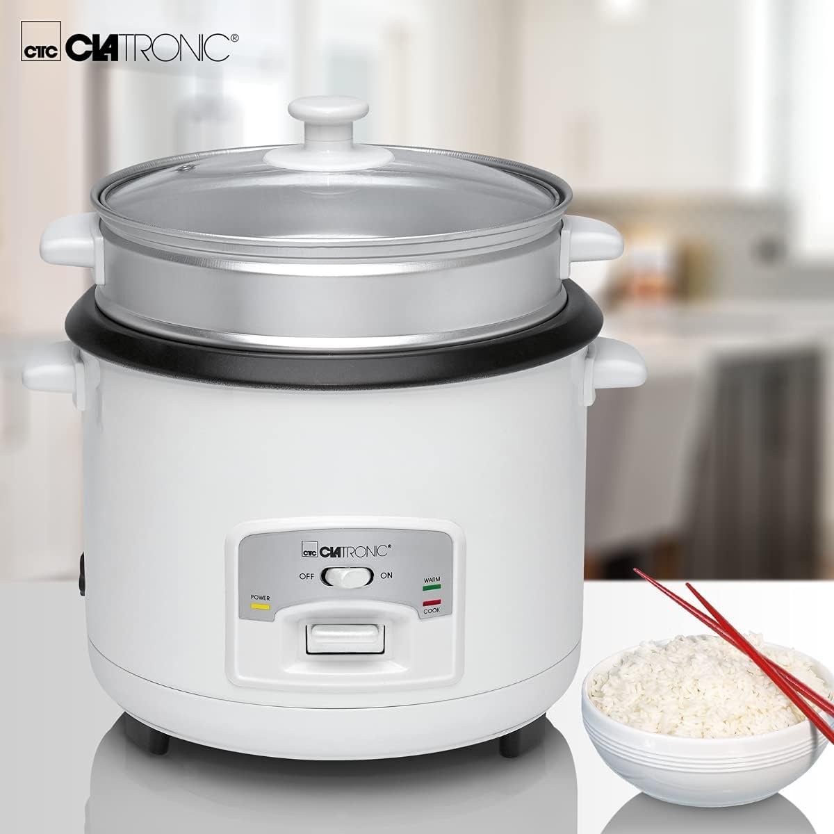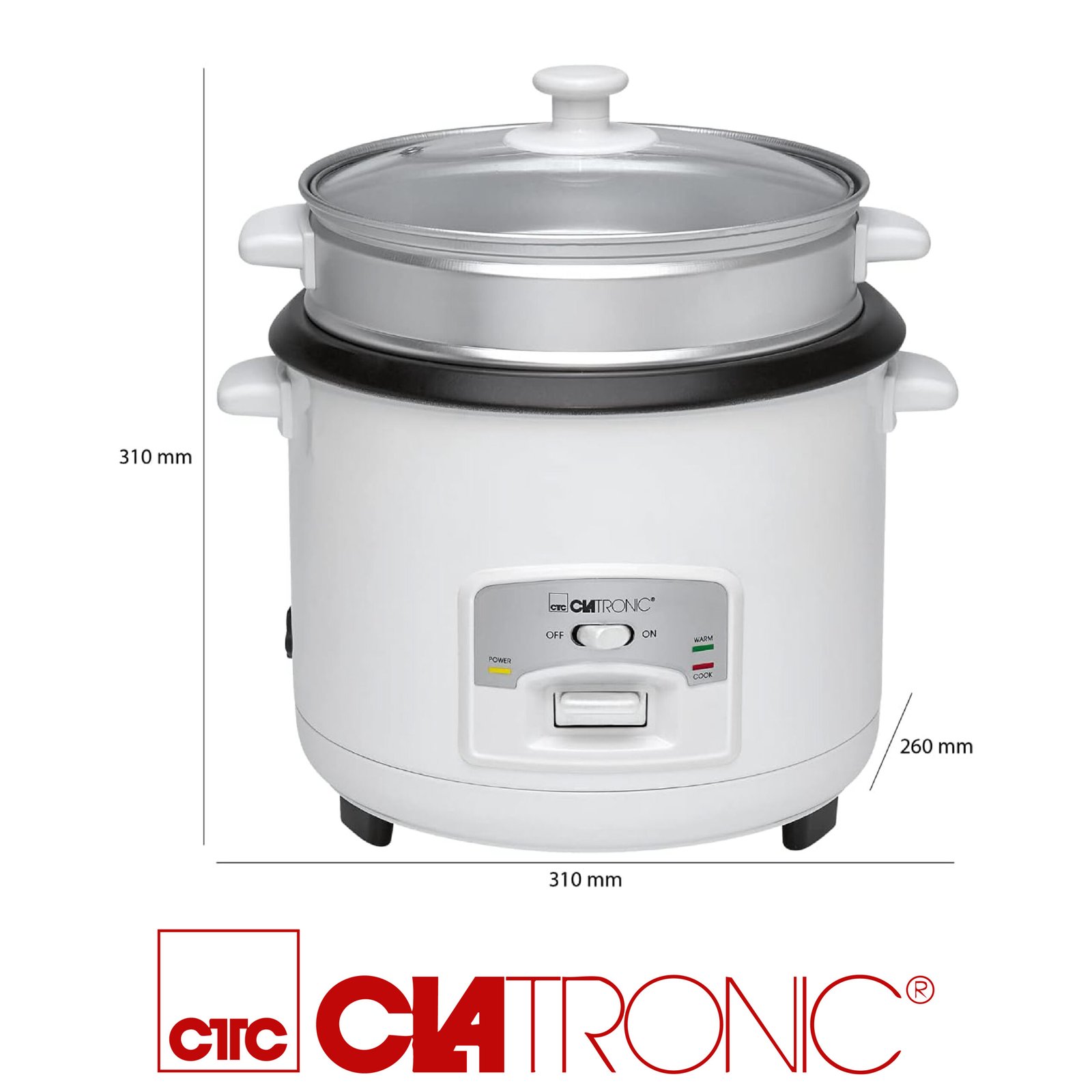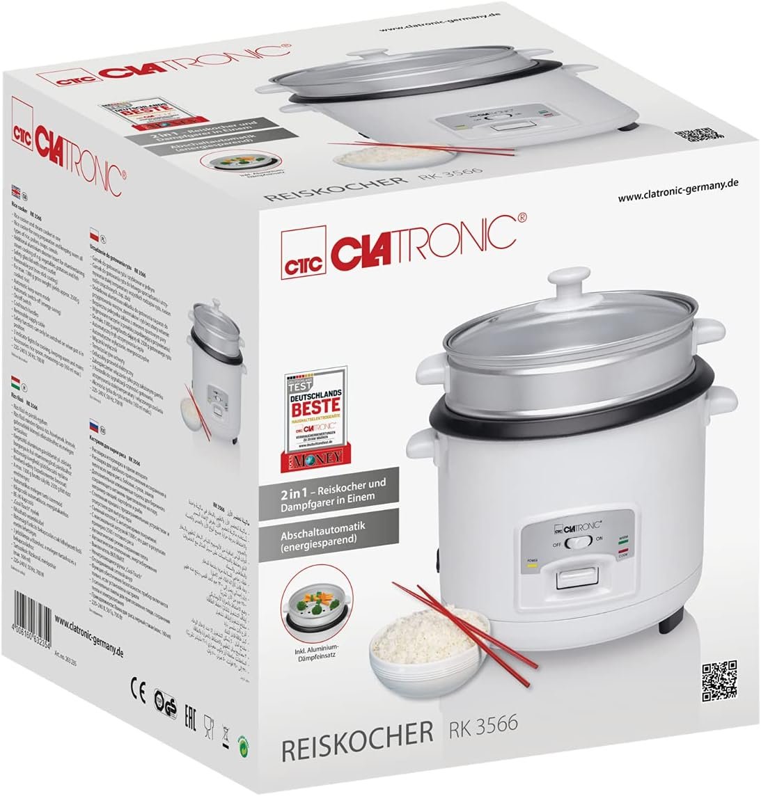 Clatronic Appareil Électroménager 2 en 1 – Cuiseur Riz à Revêtement Anti-adhesif – Cuiseur à Vapeur – Avec Panier à Étuver en Aluminium – RK 3566 Blanc
