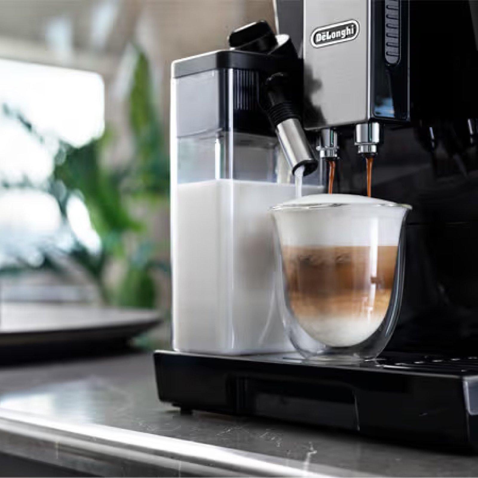Machines à caféDe’Longhi Rivelia EXAM440.55.W, Machine à Café Automatique avec LatteCrema Hot, Mousseur de Lait Automatique, Taille Compacte, 16 Recettes, Écran Tactile Couleur, Blanc Arctique