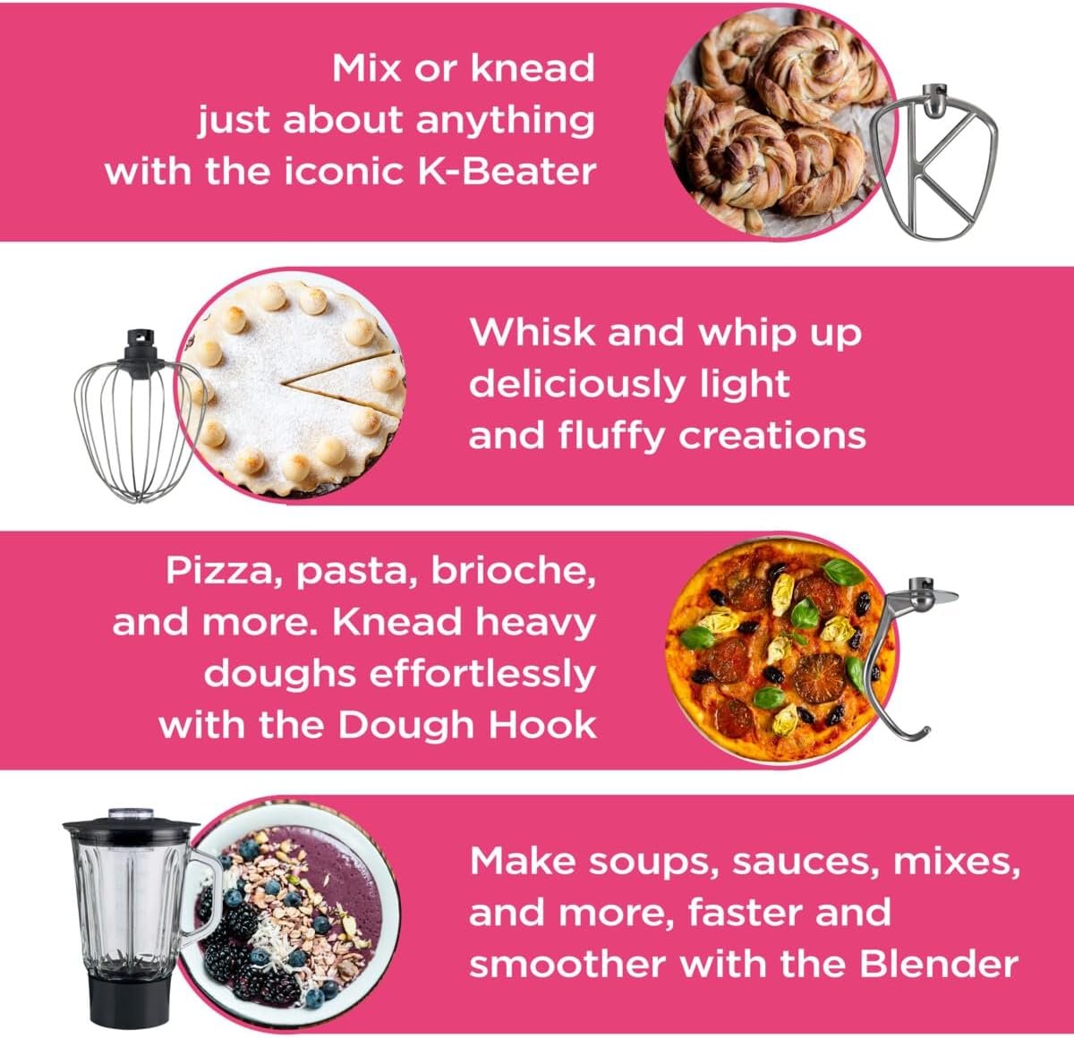 Kenwood Robot Pâtissier HOMEBAKE KHH01.120SIRobot de cuisine 1400 W avec blender intégré, idéal pour la pâtisserie et la cuisine au quotidien.Doté d’un bol en acier brossé de 5 L, il est livré avec les accessoires essentiels : batteur K, fouet, crochet pétrisseur et couvercle anti-éclaboussures.