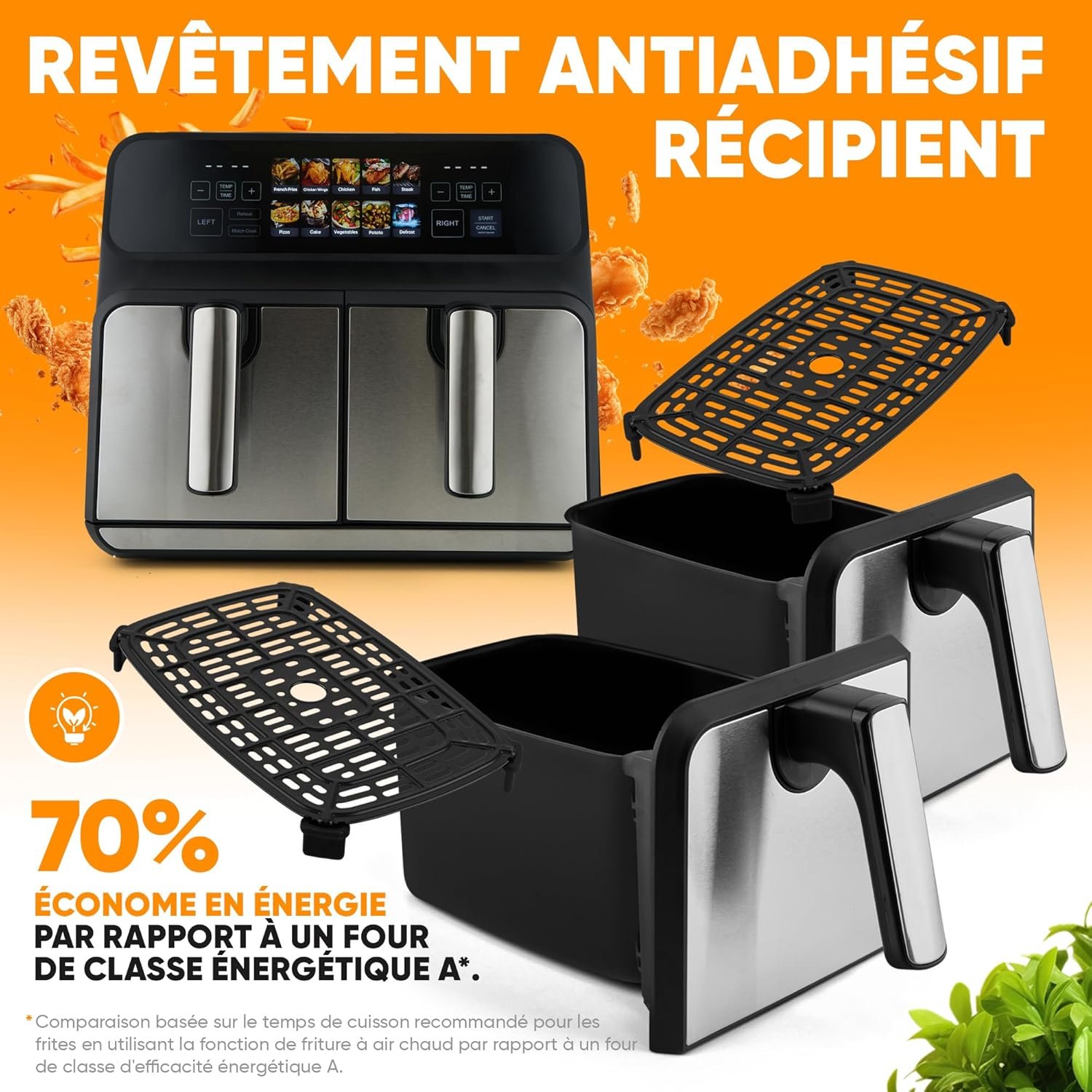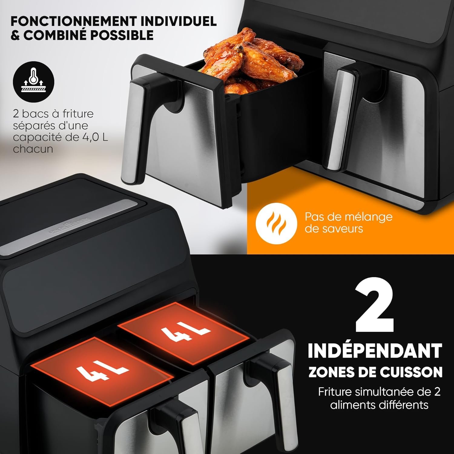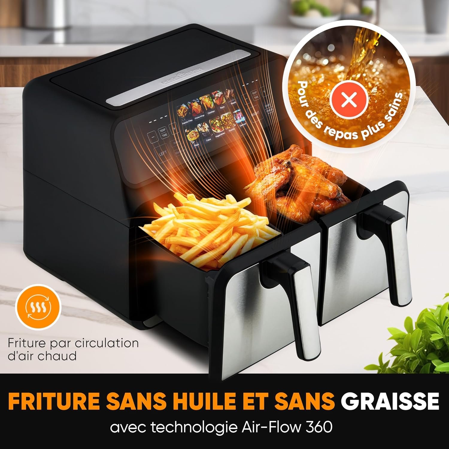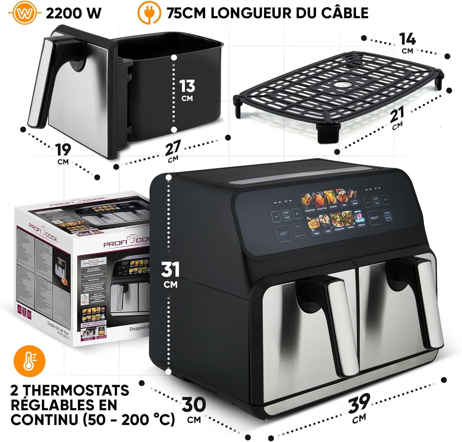 ProfiCook® Friteuse à air chaud | 2 compartiments | 8 litres (2×4 L) | Double compartiment | pas d’huile ni de graisse | Air Fryer | Écran couleur | Double friteuse à air chaud 2200W | PC FR 1287 H